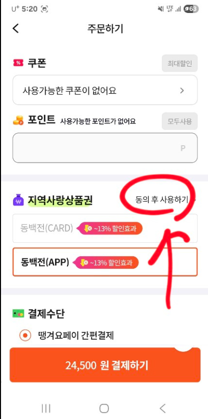 사용 방법은 아래와 같이 주문하기 화면에서 [지역사랑상품권] 부분을 찾은 후 먼저 [동의 후 사용하기]를 클릭해서 약관에 모두 동의를 한번 해주어야 한다. 그렇게 동의 후 화면이 동백전 잔액조회로 이동되는데 이때 본인의 동백전 금액을 확인하고 실제로 결제할 금액을 입력하면 된다. 전체가 아니고 일부만도 사용할 수 있어서 좋은 거 같다.