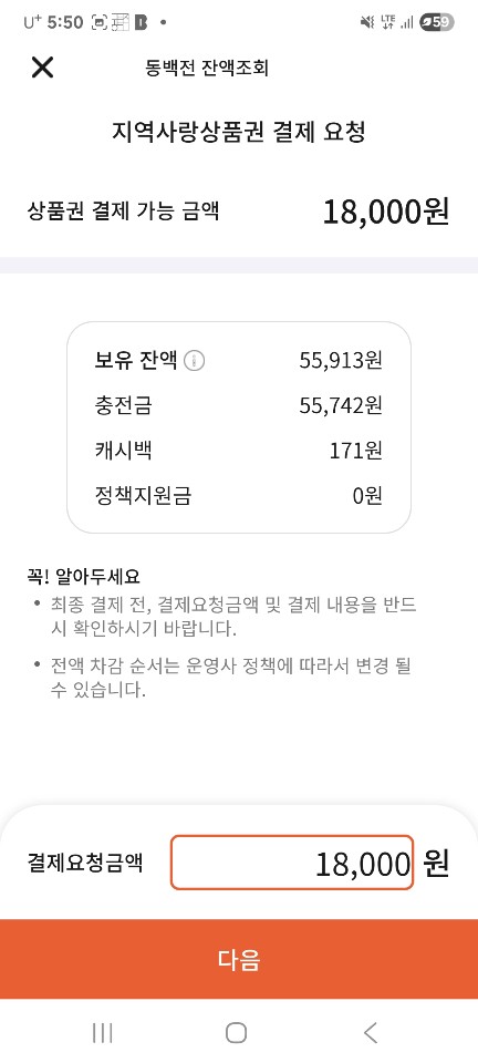 그렇게 금액을 입력하고 다음을 누르면 지역사랑상품권 옆에 18,000원 사용이라고 문구가 나오고 하단에는 0원 결제하기가 노출된다. 동백전은 매달 조금씩 사용하는 편이라 신용카드 사용을 줄이기에도 좋고 캐시백도 10% 정도 들어와서 왠지 조금 더 알뜰하게 쇼핑을 하는 기분이다.