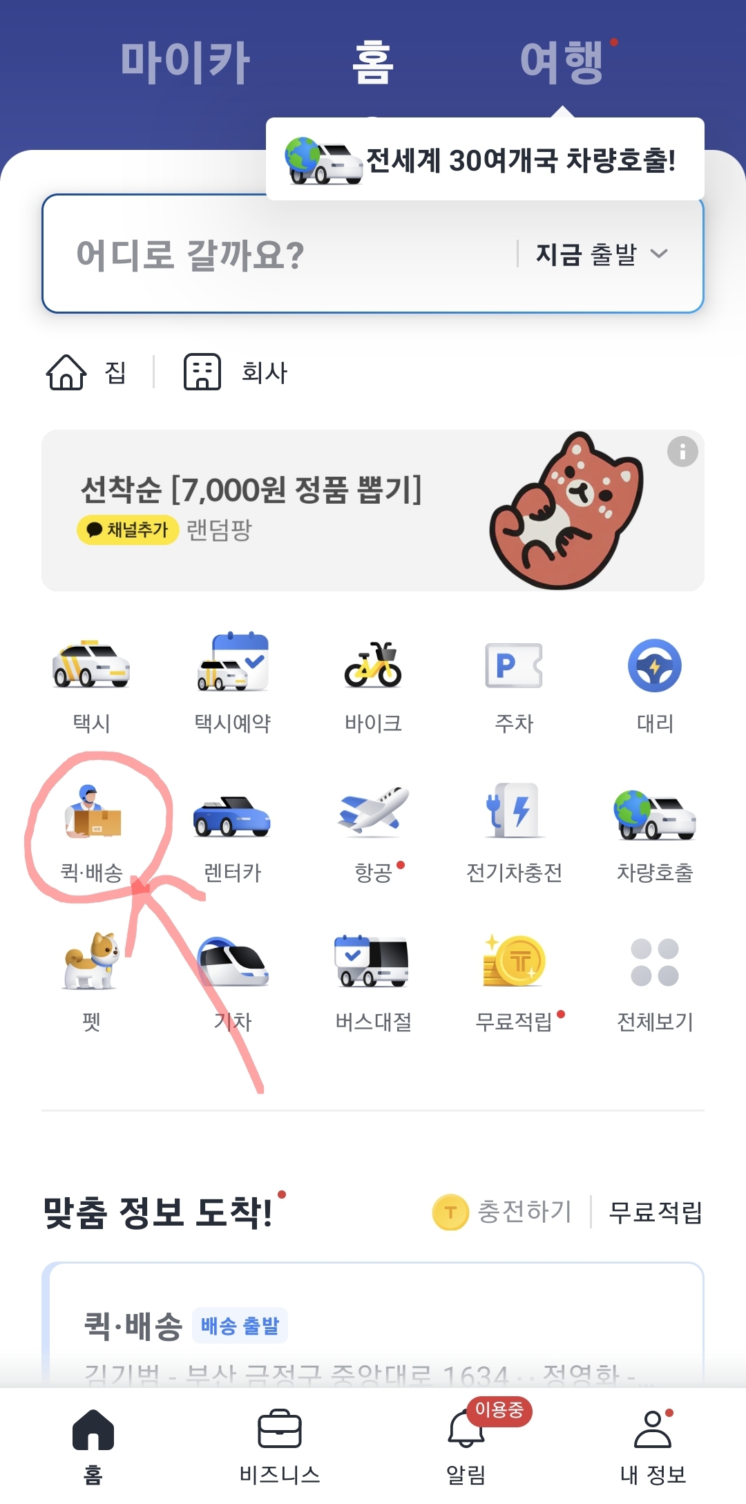 카카오T 어플을 설치 하니 택시, 바이크, 대리, 렌터카, 버스대절 까지 굉장히 많은 메뉴를 사용 할 수 있었다. 그 중 퀵 배송도 있어서 궁금함에 보낼 곳이 있어서 이용해 보았다.