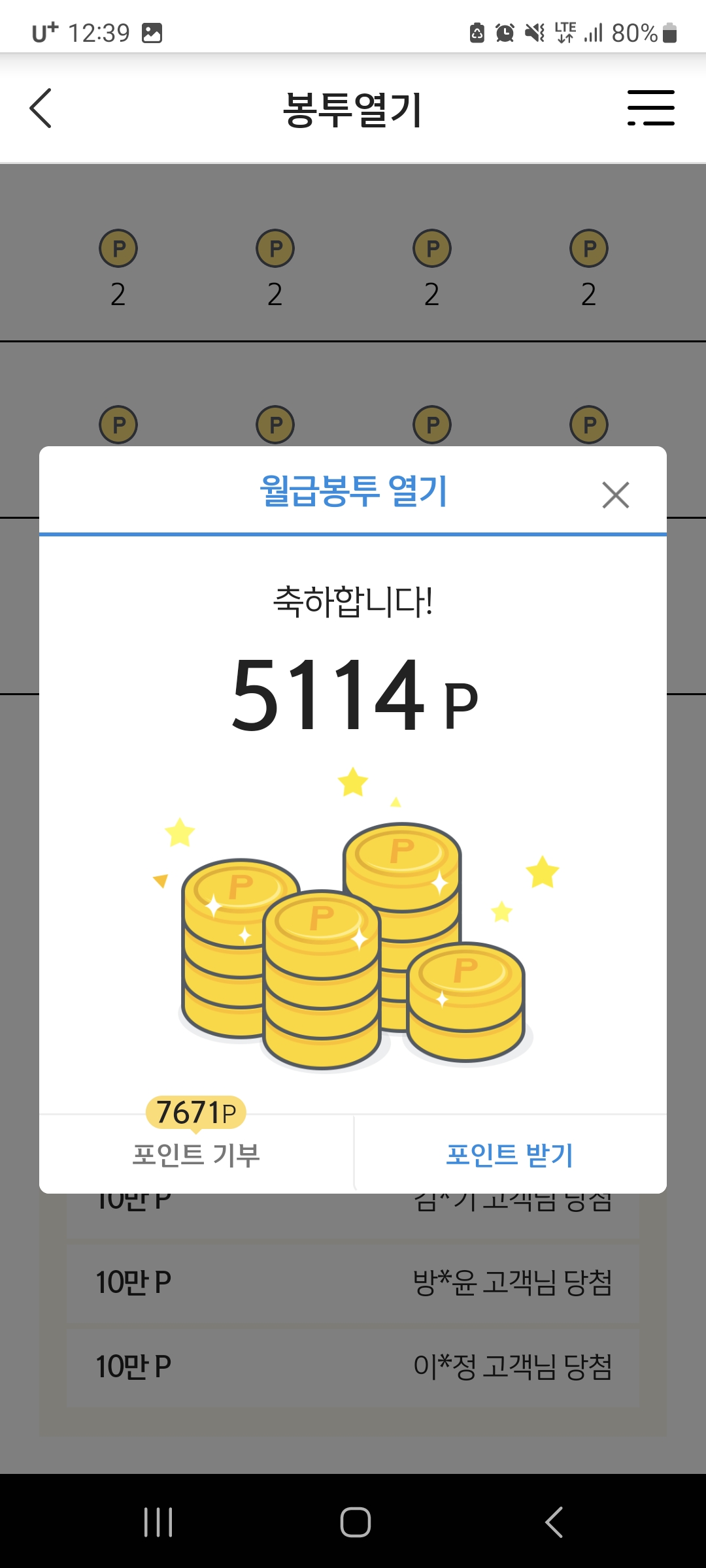 생성된 봉투 마다 보통은 2p 정도 생기서 10포인트 가 되곤 하는데 이번에는 확인해 보니 갑자기 5000포인트가 열렸다.