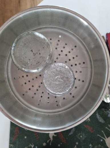 1. 깨끗이 세척된 유리병을 입구가 찜기 바닥으로 향하게 세운다음 찜기에 물을 붓고 물이 끓을때까지 조금 기다린다. 뚜껑을 닫고 하는것이 전체적으로 소독이 더 잘 되는거 같다.