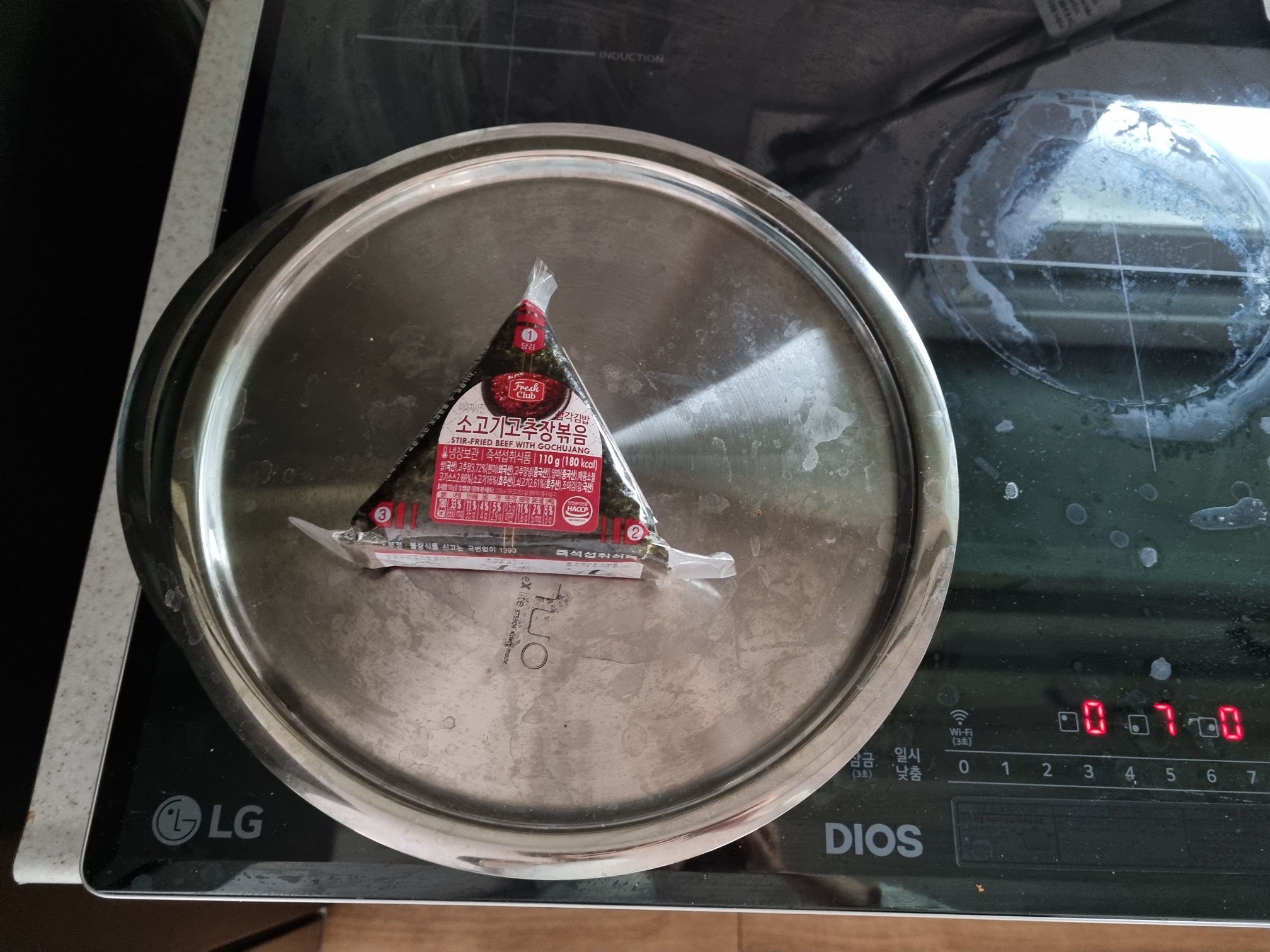 찜기도 있기만 삼각김밥은 김이 바삭 해야 맛있기에 찜기에는 수분이 많아서 찔수는 없고 요렇게 보리차를 끓일때 뚜껑이 평평한 냄비 위에 올려 두면 7단에서 3분 정도만 앞 뒤로 데워도 맛있게 데워진다.