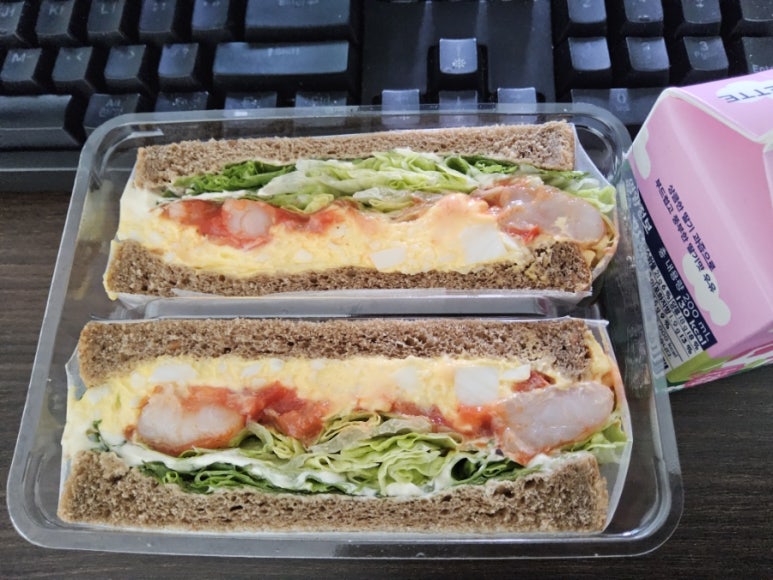 파리바게트에서는 쉬림프샌드위치와 딸기우유 그리고 금액을 맞출려고 아이스크림을 추가 했는데 금액을 맞추기가 애매할때 아이스크림 같은걸 추가 해도 좋다. 에그샌드위치를 주문했는데 마감시간이라 그런지 샌드위치가 품절이라고 해서 에그쉬림프샌드위치로 주문했는데 새우가 생각보다 무척 크게 들어가 있고 에그마요 샐러드도 맛있고 야채도 무척 신선한다. 소스는 약간 타코에 들어가는 칠리 소스 같기도 한데 엄청 맵거나 짜지는 않아서 약간 케찹이 생각나기도 하는 맛이다. 자극적인 맛을 좋아 한다면 케찹을 더 뿌려 먹으면 에그마요와 더 잘 어울리는거 같다.